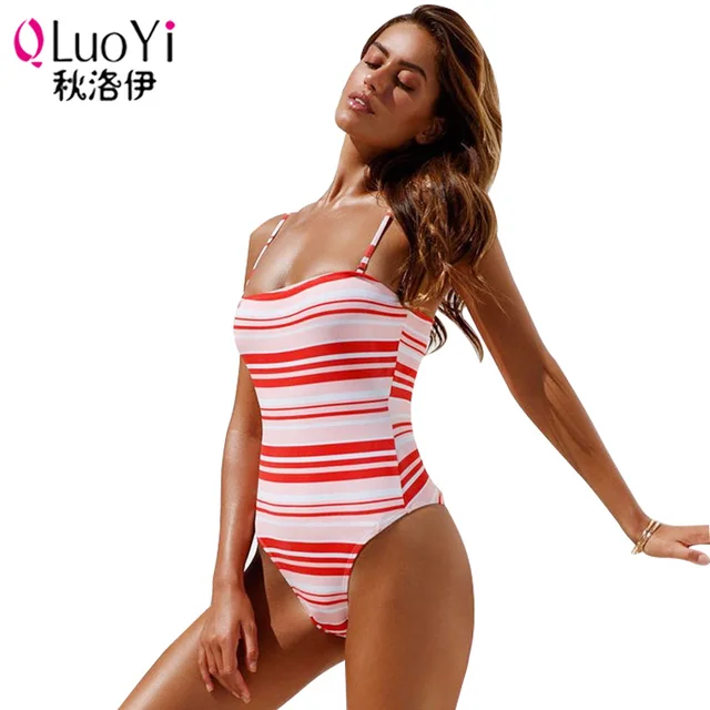 Special Price QLuoYi Women Beach Sexy Summer Swimsuit Stripe Sling Swiming Clothes Female One-piece Suit Bikini Roupas De Banho Feminina 8.11