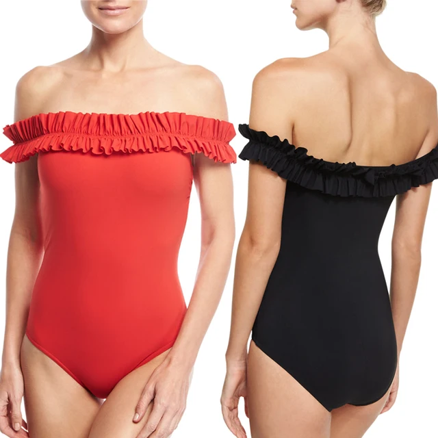 How Do I Get - One-Piece Suit A Word Shoulder Halter Ruffled Sexy Swimwear Solid Color Bikini Swimsuit Women Beach Bikini Set Black Red Biquini Cheap